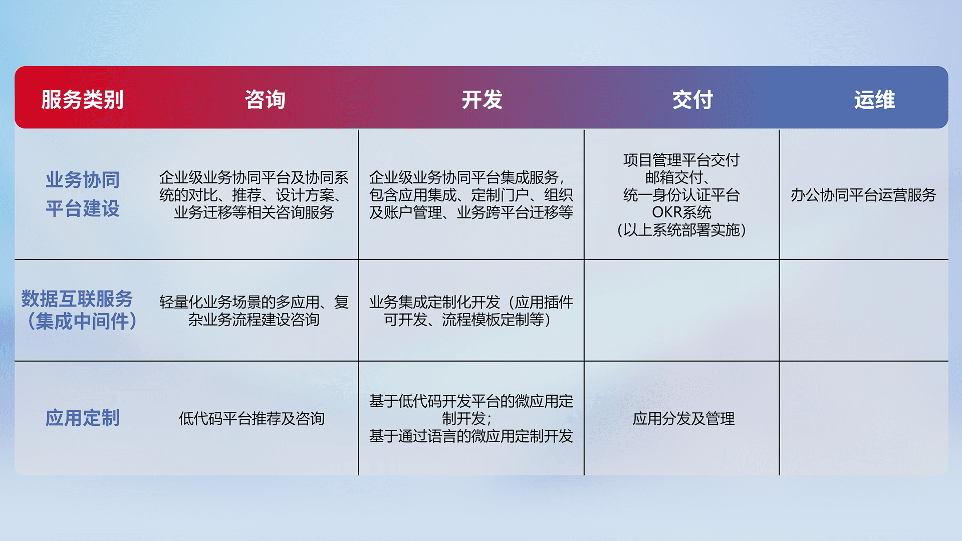 针对钉钉、、、企微、、IDaas等平台级产品提供产品的规划、、、、方案、、、交付、、、定制化开发等服务,,实现如统一协同办公、、、智能客户服务、、、混合会议管理、、、智能数据查询、、、等业务场景,,,,实现数字化转型。。
