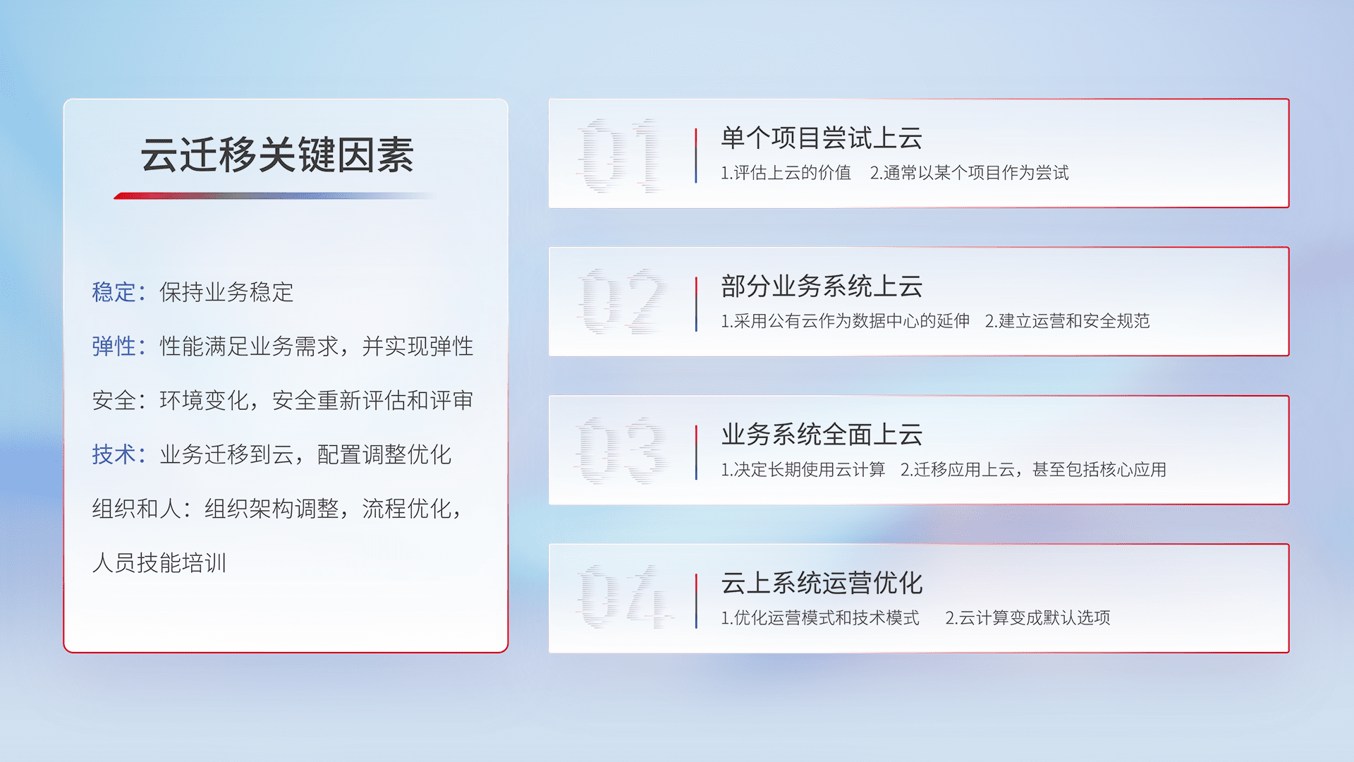 结合实际业务,,,从规划设计、、云平台选型、、、云原生改造、、、、数据迁移、、、、集成交付,,,迁移全过程为客户识别最佳上云路径,,,,做好风险识别管理,,,设计网络架构、、、身份权限、、安全审计合规、、操作审计、、、日志审计、、、、监控告警策略、、、、多站点容灾设计等,,,,对云上基础设施进行整体规划,,,提升IT治理水平,,,以满足弹性、、高可用、、高性能的需求。。。。