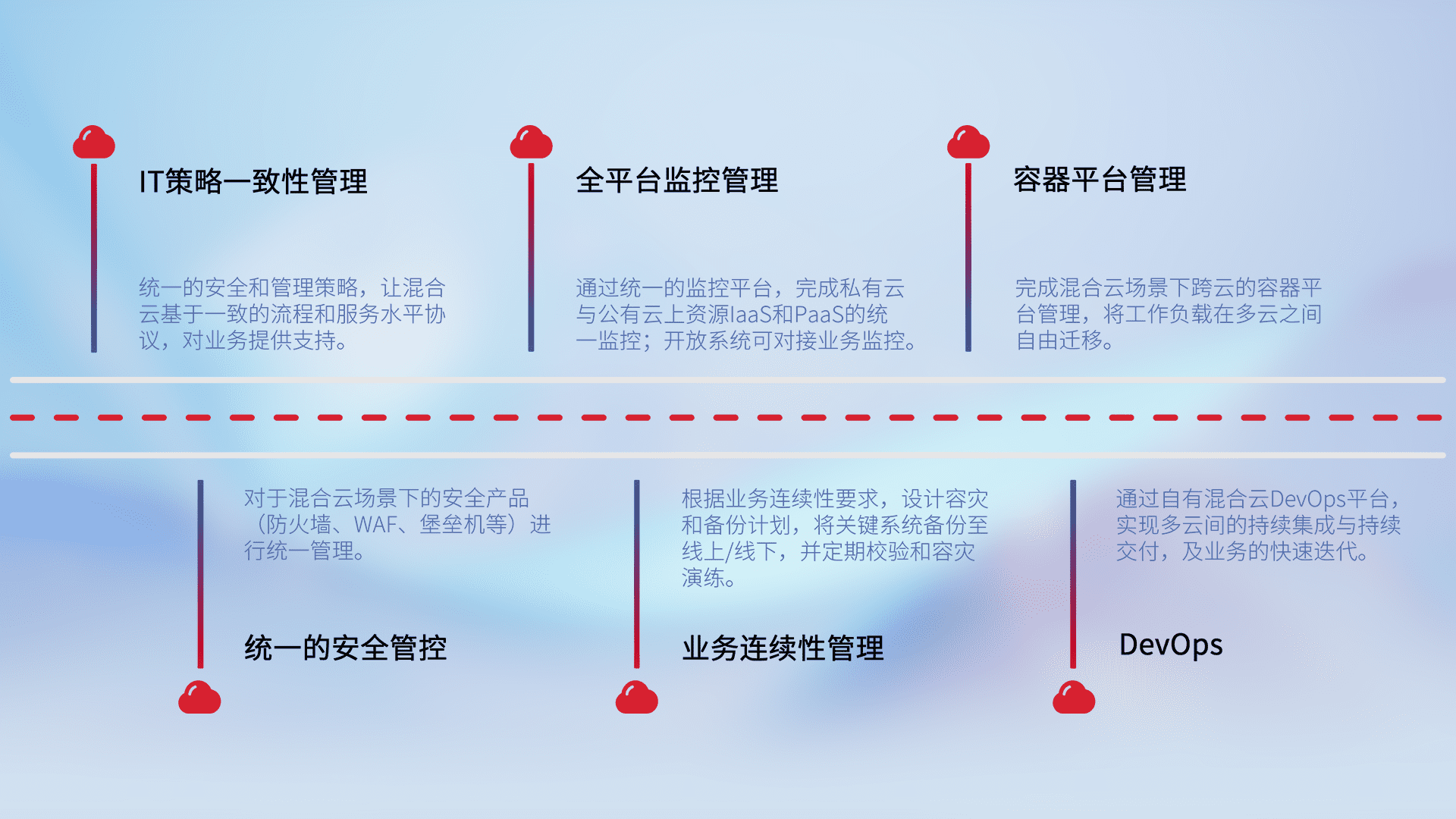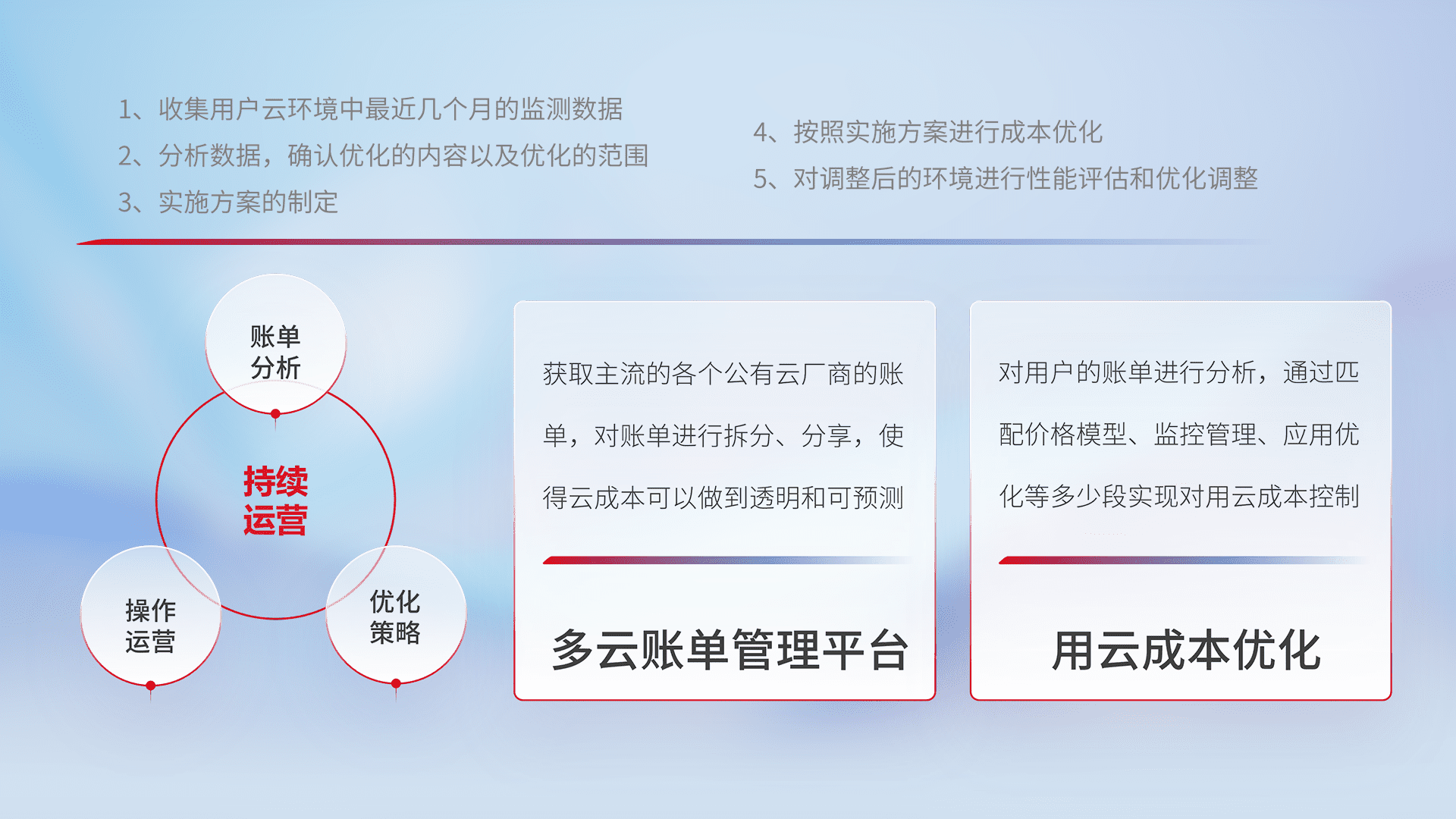 通过多云纳管,,以统一的资源数据模型把客户的云资源进行抽象和封装,,,,进而实现对多云资源的统一操作,,保障云资源管理的可靠性、、、、稳定性与可用性。。量身定制化运维内容,,,配置、、开发运维、、补丁管理、、、备份、、、、监控、、、、认证和访问管理、、审计和日常巡检等,,,,保障在用云过程中的可靠度,,,,稳定度以及高可用率。。。